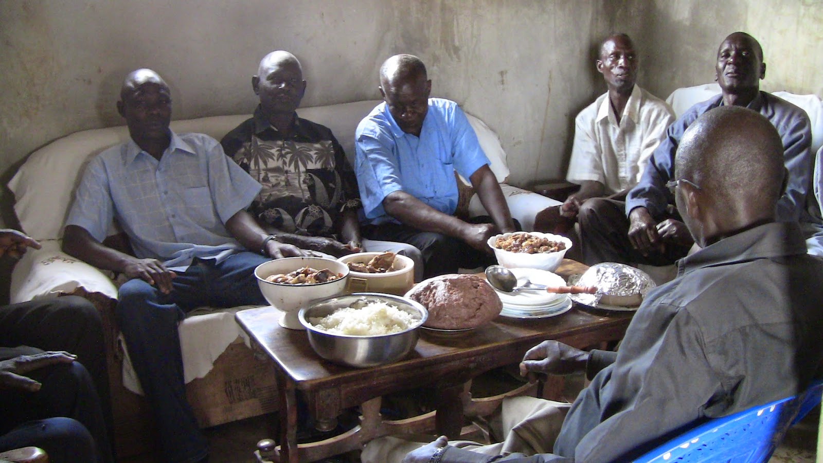 Uncles of Lucy share a hearty meal of brown Ugali (millet), roasted goat, and traditional chicken during the wedding celebrations.