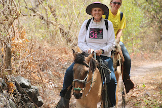 We loaded up the mules and horses and took off.  We walked through the village of San Buenaventura until we turned off onto a trail to the mountains.  Soon, we were navigating a very narrow trail, about mule width.  Thanks be to God, the mules and horses had more experience and confidence than we did as we rode down steep, hairpin turns on a trail that was slippery and rocky at the same time.  As the animals were watching their steps, we were watching the beautiful scenery.
