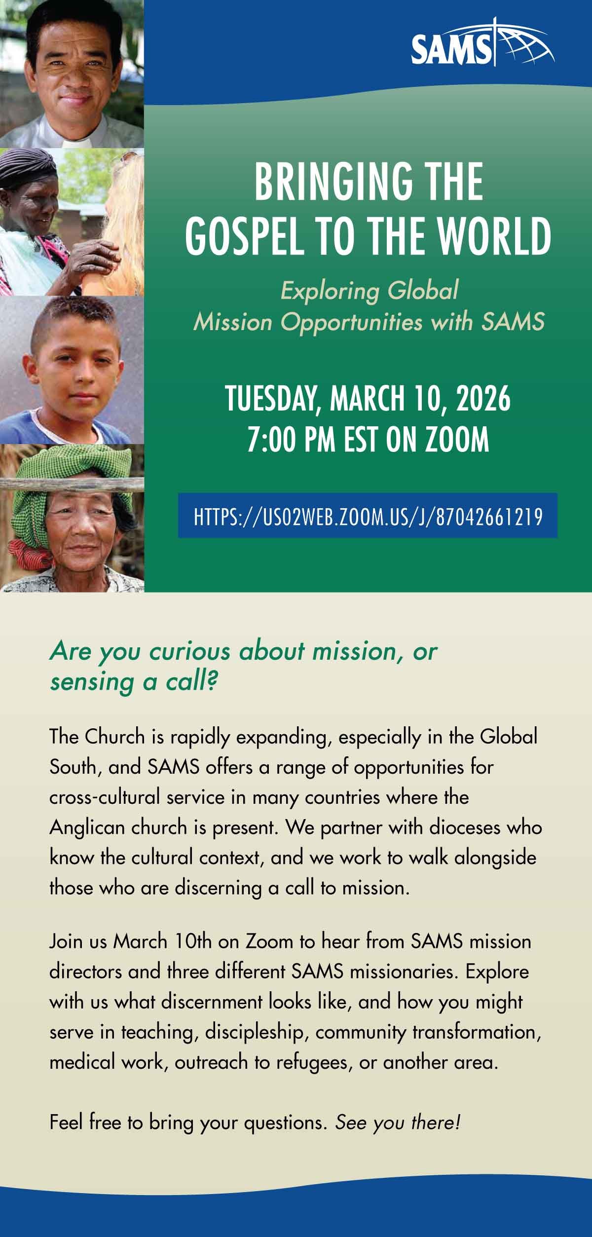 SAMS Mission Opportunities by Brendan Kimbrough | Feb 13, 2026 | SAMS Missionaries More detailed information here Click here for further information Submit a Comment Cancel replyYour email address will not be published. Required fields are marked *Comment * Name * Email * Website Δ