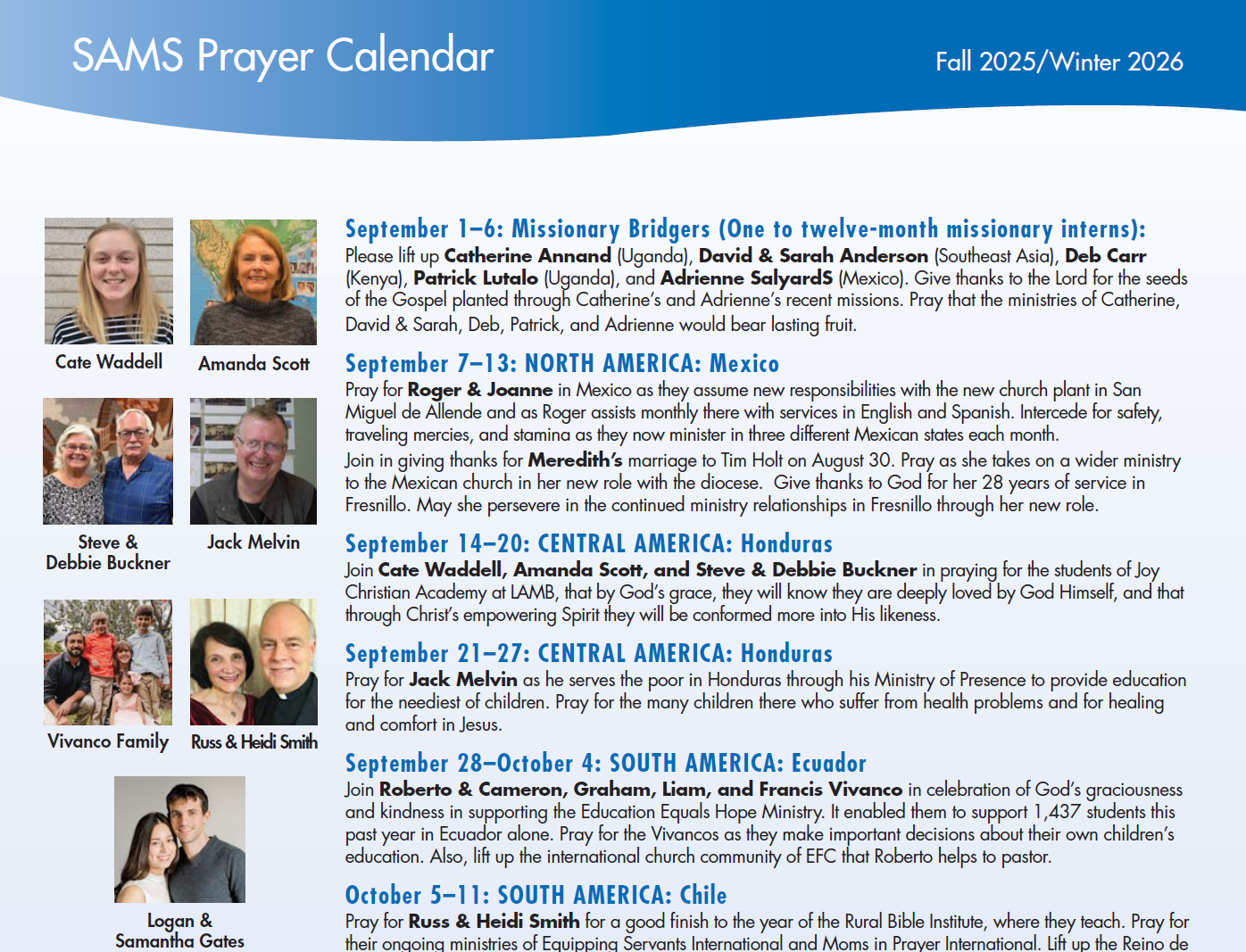 The SAMS 6-month Prayer Calendar is designed so that you can pray for all of our missionaries by name each week of the year. A PDF is available for you to print out at home, or you may follow along on our Facebook and Instagram accounts. We are grateful for your prayers and your participation with us in this ancient practice which, despite all else, by God’s grace reflects our dependence on Him alone.